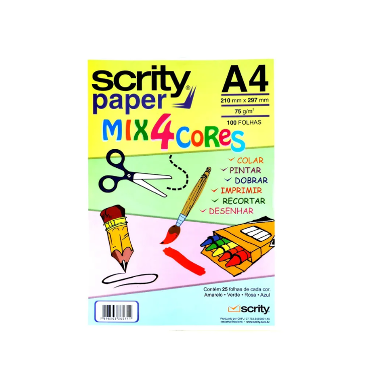 O Papel Sulfite Scrity contem Mix de 4 cores: Amarelo Verde Rosa e Azul. Papel ideal para diversos usos como colar pintar dobrar imprimir recortar e desenhar. Formato: A4 - 210 mm x 297 mm. Gramatura: 75 g/m. Contem 25 folhas de cada cor.