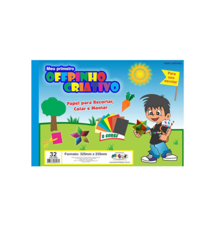 Bloco Offipinho Criativo 8 Cores 32 Folhas 325x235mm Off Paper. Bloco de papel utilizado pelas escolas para recortar, colar e montar: Meu primeiro Offpinho criativo.