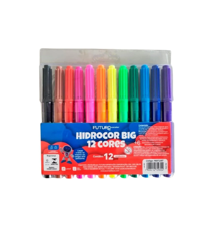 As canetas hidrograficas Big da Futuro sao a escolha perfeita para quem busca cores vibrantes e tracos marcantes. Com 12 cores sortidas, este kit oferece uma ampla gama de possibilidades para voce dar vida a sua criatividade em diversos projetos.