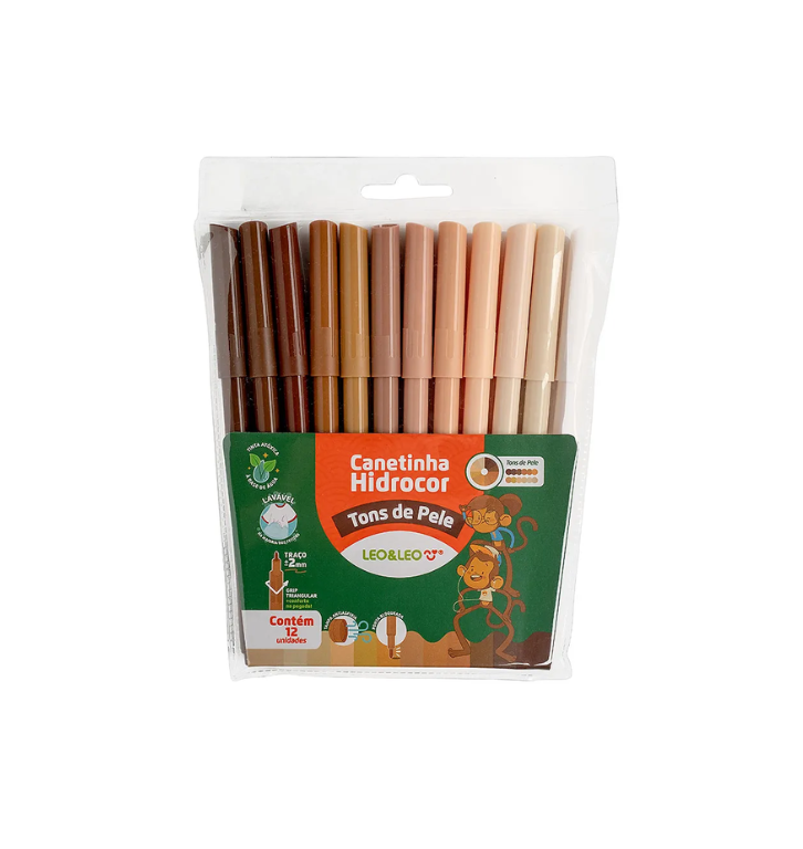 De novos tons a criatividade com o Hidrocor Tons de Pele Leo&Leo! Com 12 cores suaves e variadas, esse estojo foi pensado para valorizar a diversidade e estimular a imaginacao dos pequenos artistas. As tonalidades foram cuidadosamente selecionadas para representar diferentes tons de pele, tornando os desenhos ainda mais especiais, inclusivos e cheios de personalidade. Perfeitas para uso escolar, em casa ou em atividades de arte, as canetinhas contam com ponta arredondada, ideal para tracos firmes e preenchimento de grandes areas. O design ergonomico com corpo triangular garante mais conforto e seguranca no manuseio, facilitando o uso por criancas em fase de desenvolvimento da coordenacao motora. Alem disso, sao atoxicas, lavaveis e possuem tampa antiasfixiante, oferecendo tranquilidade para pais e educadores. Crie, brinque e aprenda com o Hidrocor Tons de Pele uma forma divertida e colorida de explorar a arte e valorizar a diversidade desde cedo!