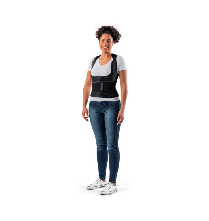 Correcao postural, prevencao e tratamento de lesoes ocasionadas por uma postura incorreta, auxilio no tratamento de cifose, escoliose, entre outros, lombalgia, alivio de dores agudas e cronicas, auxilio no tratamento fisioterapeutico. As tiras posicionadas nos ombros, tracionam eles para tras, auxiliando a correcao postural. A compressao realizada pelas abas e pelo elastico externo auxilia o alivio da dor e promove estabilidade. O material em neoprene e isolante termico, mantendo a regiao aquecida, auxiliando o alivio da dor.