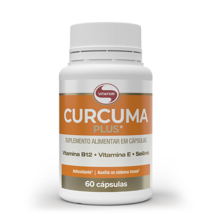 CURCUMA PLUS e um suplemento alimentar a base de Curcuma longa, adicionado de Vitamina B12, Vitamina E, Selenio e Triglicerideo de cadeia media MCT. Ingredientes: Triglicerideos de cadeia media (veiculo), extrato de rizomas de Curcuma longa, levedura enriquecida com selenio (selenio), acetato de DL-alfa-tocoferol (vitamina E) e metilcobalamina (vitamina B12). Composicao da capsula: gelatina, agua purificada e umectante glicerina. Nao contem Gluten.
