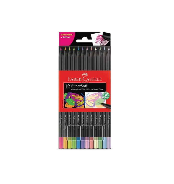 LAPIS DE COR FABER-CASTELL 12 CORES SUPER SOFT 6 NEON + 6 PASTEL. Com o Lapis SuperSoft Faber-Castell voce tera a melhor qualidade e um lindo resultado em seus trabalhos! Sao 12 EcoLapis de Cor, sendo 6 cores Neon, para iluminar seus desenhos, e 6 cores Pastel, dando um toque mais doce e delicado. Mina supermacia exclusiva, garantindo o maximo de conforto ao pintar. Eles possuem cores mais vivas e com otima cobertura, sobre papeis claros e escuros.
