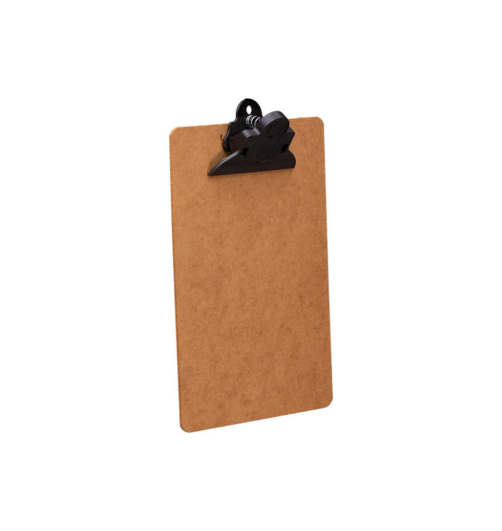 Prancheta em chapa de Eucatex com pegador de plastico resistente. Disponivel no tamanho 1/2 oficio (235x160 mm).