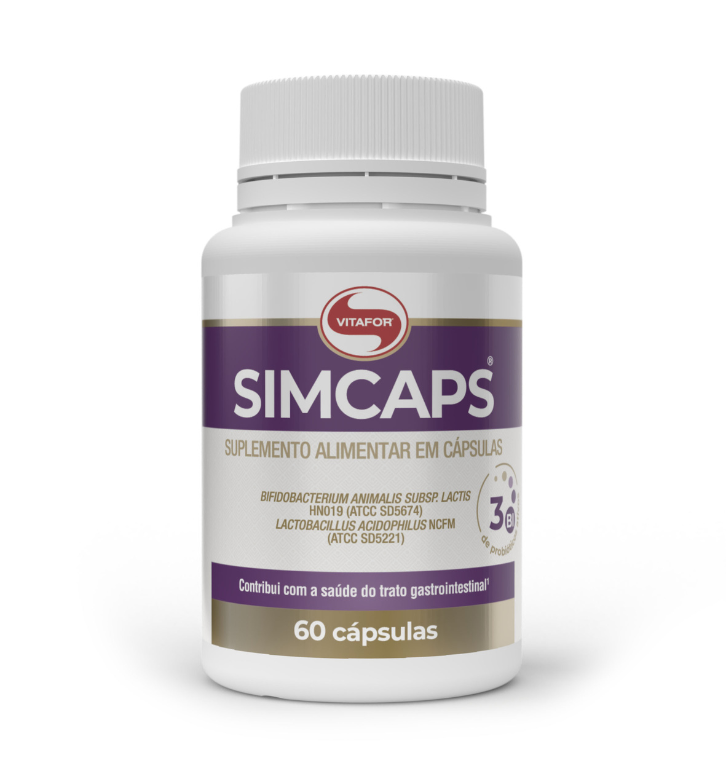 SIMCAPS e a combinacao de duas cepas probioticas que contribuem com a saude gastrointestinal. O Bifidobacterium animalis subsp. lactis HN019 (ATCC SD5674) e o Lactobacillus acidophilus NCFM (ATCC SD5221) podem contribuir com a saude do trato gastrointestinal. Ingredientes: Frutooligossacarideos (FOS), Bifidobacterium animalis subsp. lactis HN019 (ATCC SD5674), Lactobacillus acidophilus NCFM (ATCC SD5221) e antiumectante estearato de magnesio. Composicao da capsula: Hidroxipropilmetilcelulose (HPMC), agua purificada, opacificador (corante carbonato de calcio e amido modificado), gelificante carragena e regulador de acidez acetato de potassio. NAO CONTEM GLUTEN.
